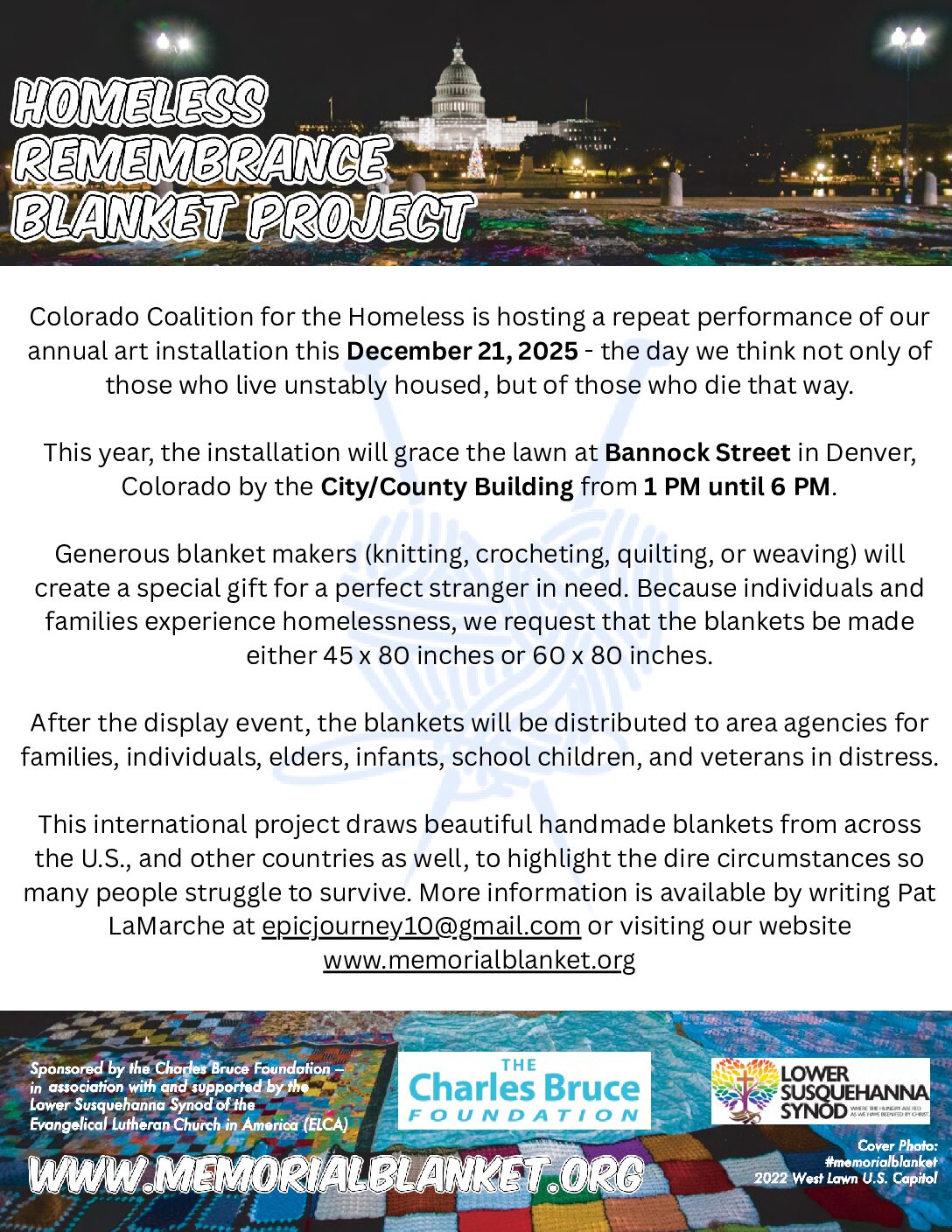 • Homeless Memorial Blanket Project and Colorado Coalition for the Homeless announce blanket display alongside long standing vigil in Denver on Dec. 21